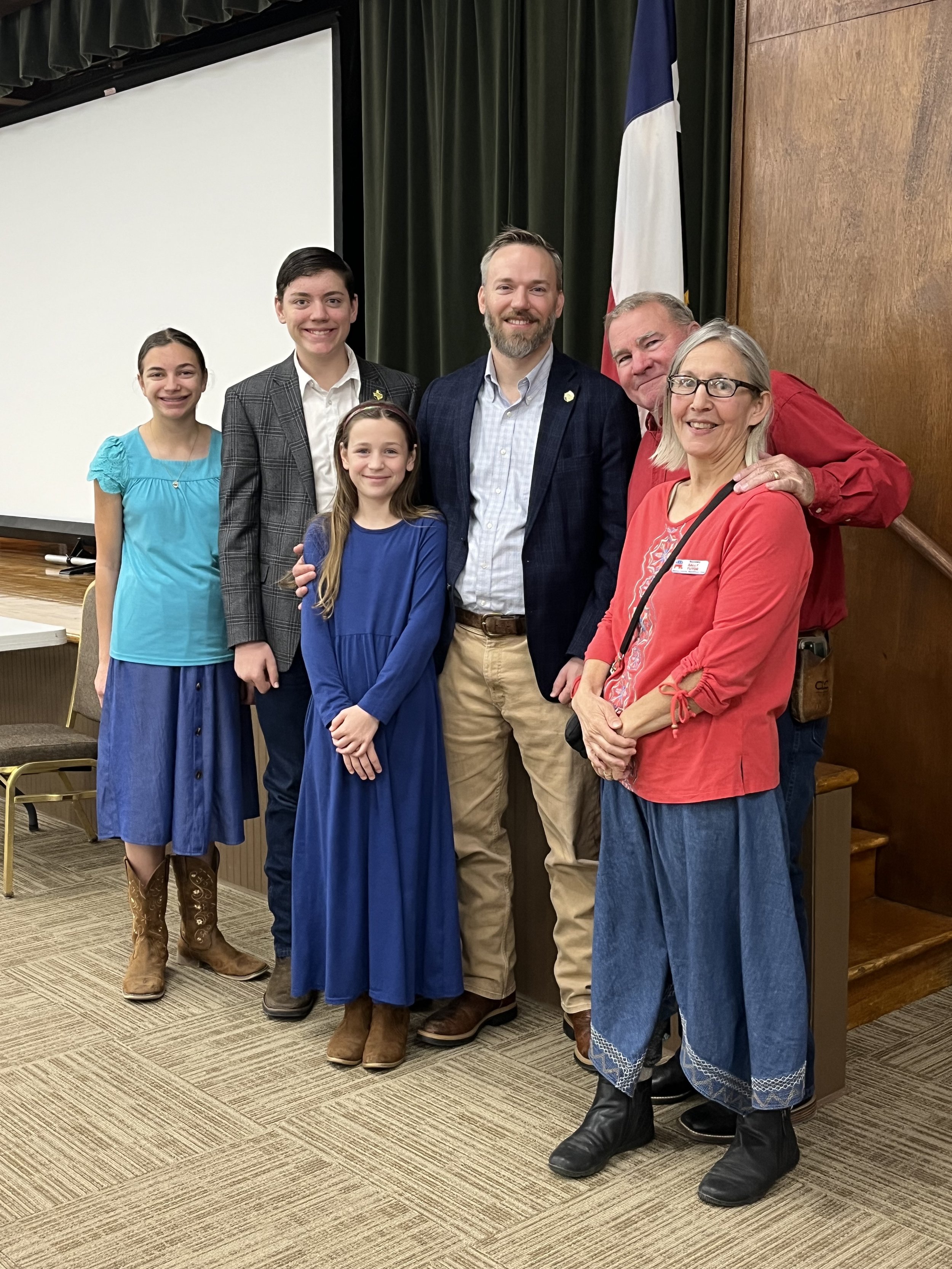 Leah, Alamo, Faye, & Bradley Pierce joined long-time friends Russell & Sally Tutor in front of the Texas Flag for a photo after the meeting.
